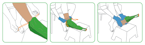 • Wenn Sie Ihre Strümpfe selbständig anziehen, empfehlen wir Ihnen, Ihren Fuß auf einen niedrigen Stuhl/Hocker (ca. 40-45 cm hoch) zu stellen, damit Sie Ihre Zehen leichter erreichen können, ohne sich zu sehr oder zu oft bücken zu müssen.